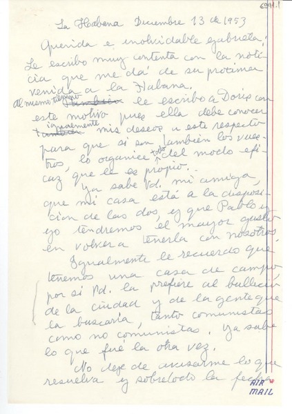 [Carta] 1953 dic. 13, La Habana, [Cuba] [a] Gabriela Mistral [manuscrito] Dulce María Loynaz.
