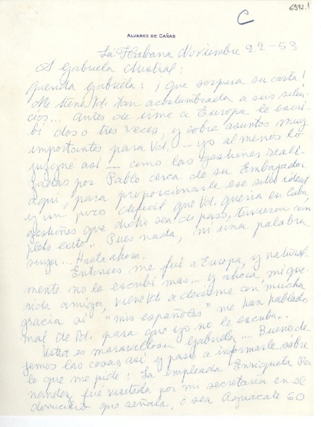 [Carta] 1953 nov. 22, La Habana, [Cuba] [a] Gabriela Mistral [manuscrito] Dulce María Loynaz.
