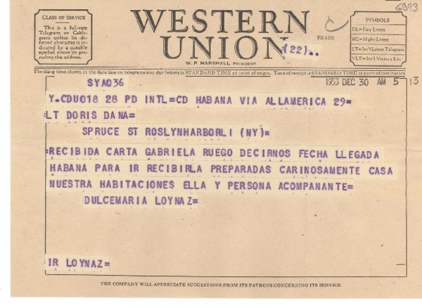 [Telegrama] 1948 nov. 20, [La] Habana, Cuba [a] Gabriela Mistral, Mérida, Yuc[atán], [México] [manuscrito] Dulce María [Loynaz].