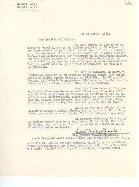[Carta] 1949 mar. 28, México D.F. [a] Gabriela [Mistral], [México] [manuscrito] Gabriel Méndez Plancarte.