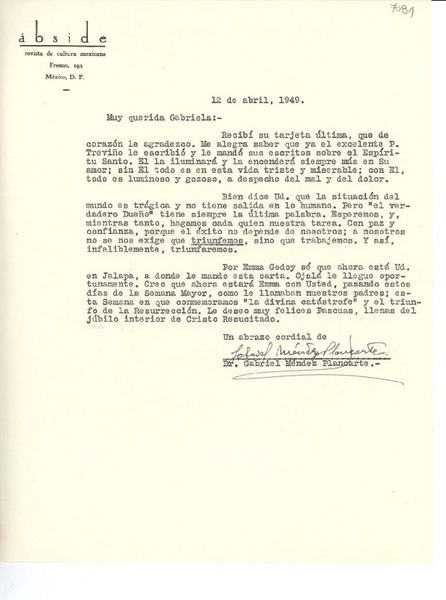 [Carta] 1949 abr. 12, [México D.F.] [a] Gabriela [Mistral], [Jalapa, México] [manuscrito] Gabriel Méndez Plancarte.