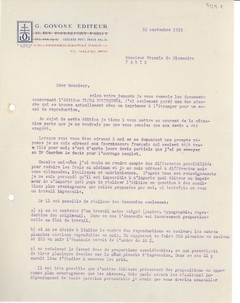 [Carta] 1933 sept. 29, Paris, [Francia] [a] Francis de Miomandre [manuscrito] G. Govone.
