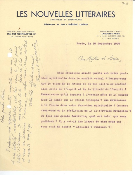 [Carta] 1939 sept. 18, Paris [a] [Gabriela Mistral] [manuscrito] Francis de Miomandre.