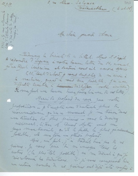 [Carta] 1939 sept. 21, Fontainebleau, [Francia] [a] [Gabriela Mistral] [manuscrito] Francis de Miomandre.