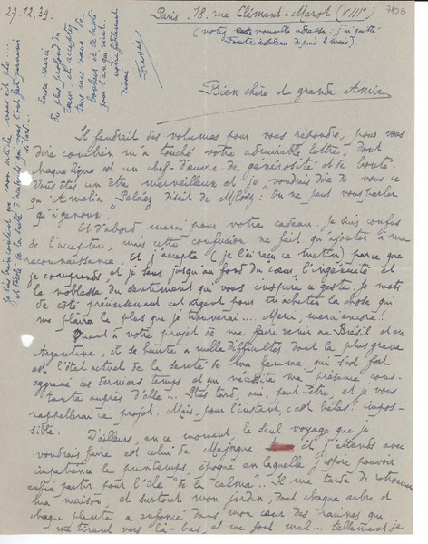 [Carta] 1939 dic. 27, Paris, [Francia] [a] [Gabriela Mistral] [manuscrito] Francis [de Miomandre].