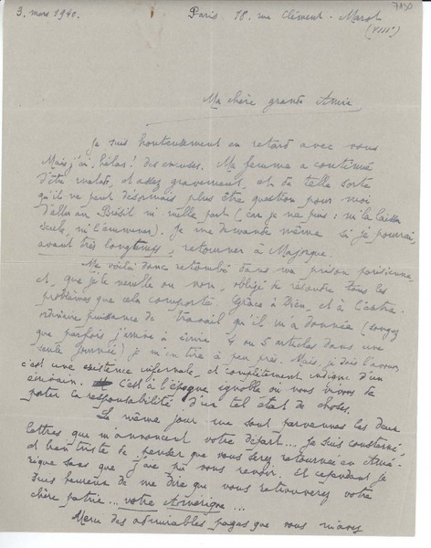 [Carta] 1940 mars 3, Paris, [Francia] [a] [Gabriela Mistral] [manuscrito] Francis [de Miomandre].