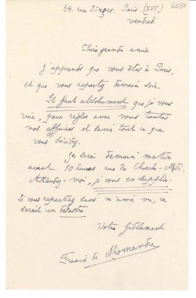 [Carta] Paris, [Francia] [a] [Gabriela Mistral] [manuscrito] Francis de Miomandre.