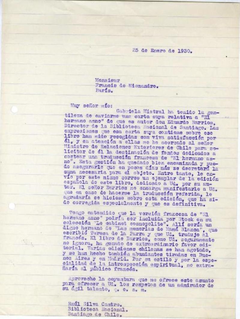 [Carta] 1930 enero 25, Santiago, Chile [a] Francis de Miomandre, París [manuscrito] Raúl Silva Castro.