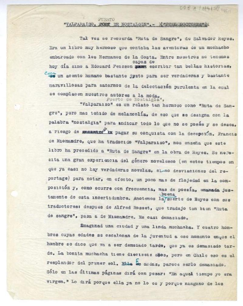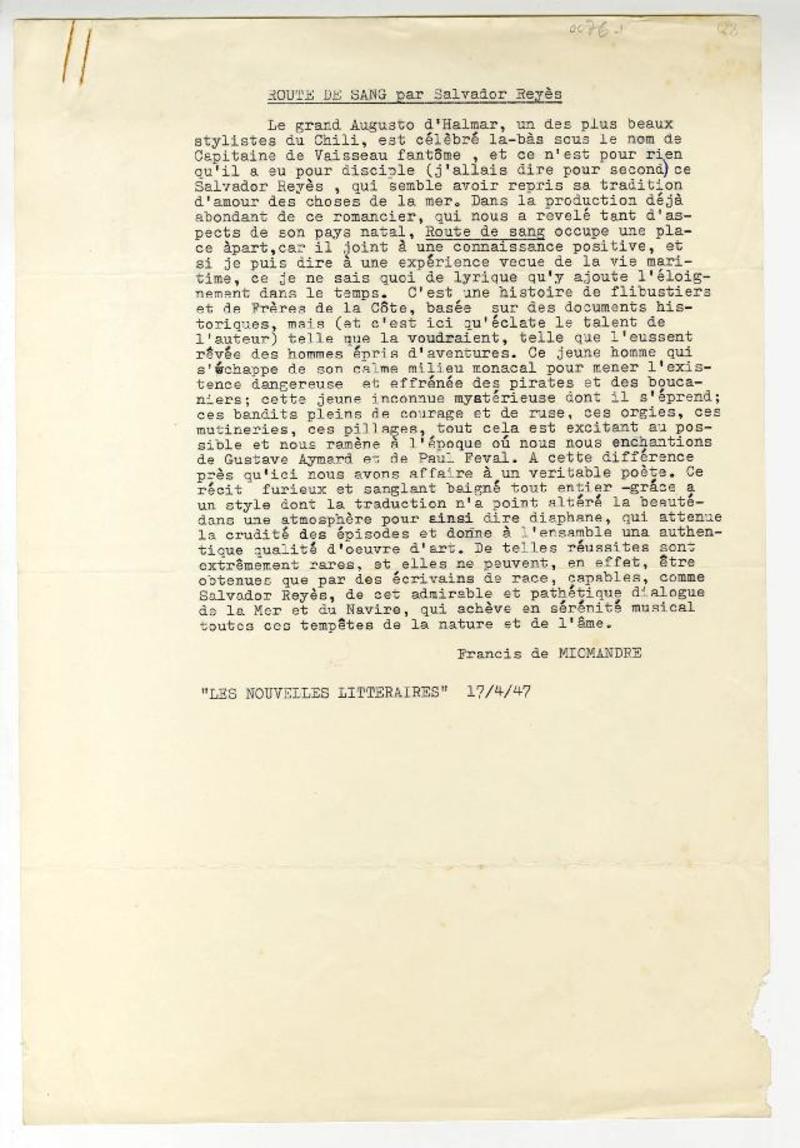 Autores franceses - Ruta de sangre - Coiplet, Robert - D'Aubarede, Gabriel - Autores chilenos - Manuscritos chilenos - Reyes, Salvador - Reseñas de libros - Miomandre, Francis de