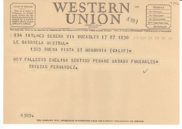 [Telegrama] 1945 nov. 16, La Serena, [Chile] [a] Gabriela Mistral, Petrópolis [manuscrito] Tristán Fernández.