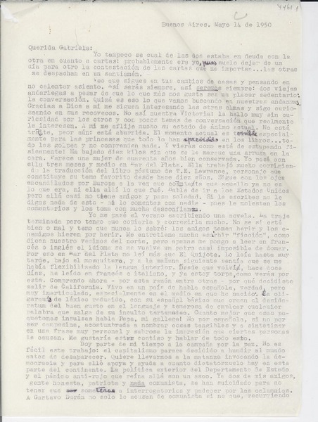 [Carta] 1950 mayo 14, Buenos Aires, [Argentina] [a] Gabriela [Mistral] [manuscrito] María Rosa [Oliver].