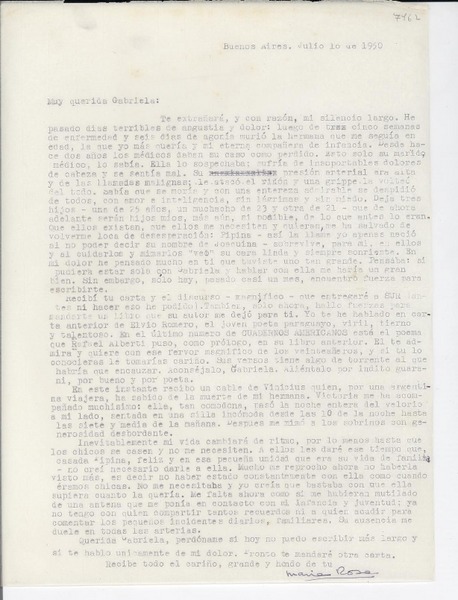 [Carta] 1950 jul. 10, Buenos Aires, [Argentina] [a] Gabriela [Mistral] [manuscrito] María Rosa [Oliver].