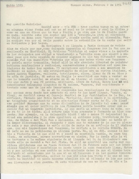 [Carta] 1951 feb. 2, Buenos Aires, [Argentina] [a] Gabriela [Mistral] [manuscrito] María Rosa [Oliver].