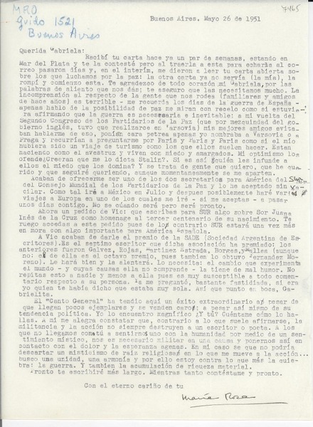 [Carta] 1951 mayo 26, Buenos Aires, [Argentina] [a] Gabriela [Mistral] [manuscrito] María Rosa [Oliver].