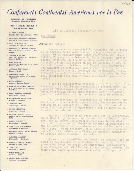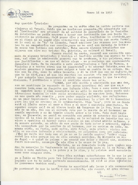 [Carta] 1952 feb. 6, [Río de Janeiro, Brasil] [a] Gabriela [Mistral] [manuscrito] María Rosa Oliver.
