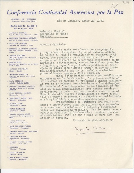[Carta] 1952 ene. 29, Río de Janeiro, [Brasil] [a] Gabriela Mistral, Nápoles, Italia [manuscrito] María Rosa Oliver.