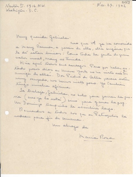 [Carta] 1942 nov. 27, Washington D. C. [a] Gabriela Mistral [manuscrito] María Rosa [Oliver].