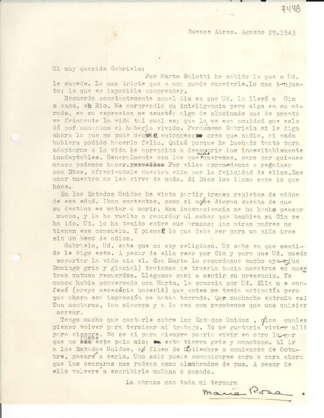 [Carta] 1943 ago. 29, Buenos Aires [a] Gabriela Mistral [manuscrito] María Rosa [Oliver].