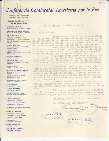 [Carta] 1952 feb. 11, Río de Janeiro, [Brasil] [a] [Gabriela Mistral] [manuscrito] María Rosa Oliver, Branca Fialho, Juan Lamatta.