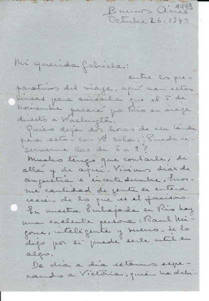 [Carta] 1943 oct. 26, Buenos Aires [a] Gabriela Mistral [manuscrito] María Rosa [Oliver].