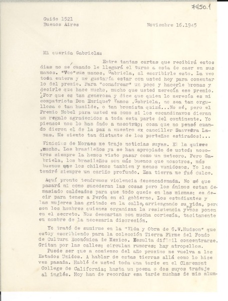 [Carta] 1945 nov. 16, Buenos Aires [a] Gabriela Mistral [manuscrito] María Rosa [Oliver].