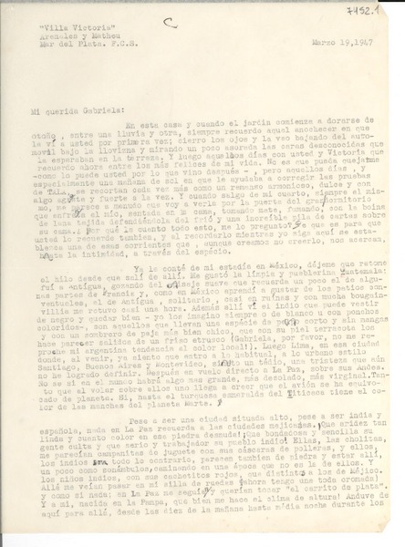 [Carta] 1947 mar. 19, Mar del Plata, [Argentina] [a] Gabriela Mistral [manuscrito] María Rosa [Oliver].