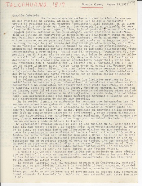 [Carta] 1952 mar. 29, Buenos Aires, [Argentina] [a] Gabriela [Mistral] [manuscrito] María Rosa [Oliver].