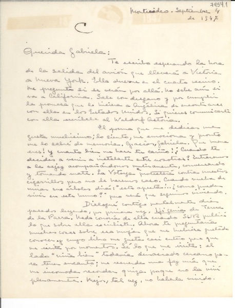 [Carta] 1947 sept. 4, Montevideo [a] Gabriela Mistral [manuscrito] María Rosa [Oliver].