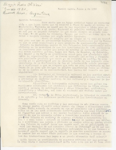 [Carta] 1952 jul. 1, Buenos Aires, [Argentina] [a] Gabriela [Mistral] [manuscrito] María Rosa [Oliver].
