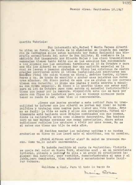 [Carta] 1947 sept. 18, Buenos Aires [a] Gabriela Mistral [manuscrito] María Rosa [Oliver].