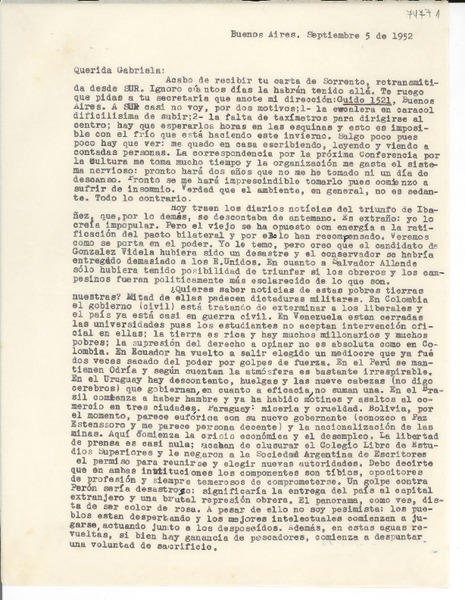 [Carta] 1952 sept. 5, Buenos Aires, [Argentina] [a] Gabriela [Mistral] [manuscrito] María Rosa [Oliver].