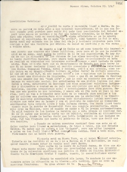 [Carta] 1947 oct. 29, Buenos Aires [a] Gabriela Mistral [manuscrito] María Rosa [Oliver].
