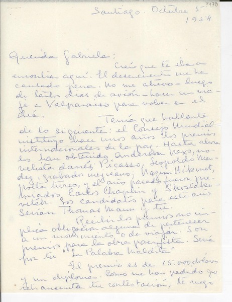 [Carta] 1954 oct. 5, Santiago, [Chile] [a] Gabriela [Mistral] [manuscrito] María Rosa [Oliver].