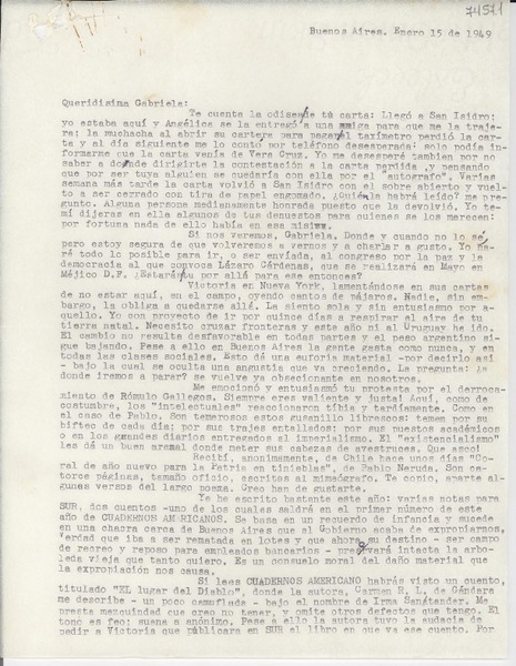 [Carta] 1949 ene. 15, Buenos Aires [a] Gabriela Mistral [manuscrito] María Rosa [Oliver].