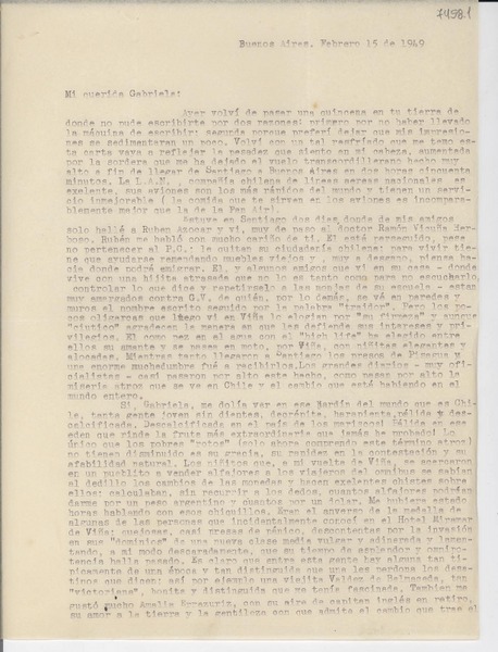 [Carta] 1949 feb. 15, Buenos Aires [a] Gabriela Mistral [manuscrito] María Rosa [Oliver].