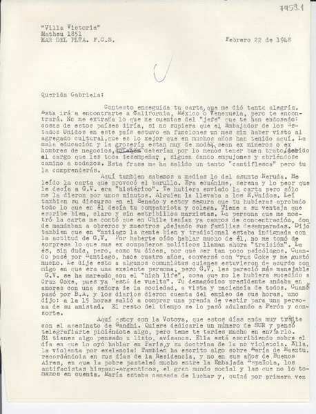 [Carta] 1948 feb. 22, Mar del Plata, [Argentina] [a] Gabriela Mistral [manuscrito] María Rosa [Oliver].