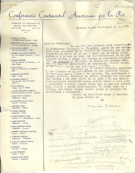 [Carta] 1951 nov. 15, Buenos Aires, [Argentina] [a] Gabriela [Mistral] [manuscrito] María Rosa [Oliver].