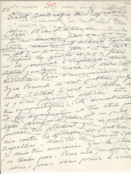 [Carta] 1954 nov. 30, Rapallo, [Italia] [a] [Gabriela Mistral] [manuscrito] Olga Rudge.