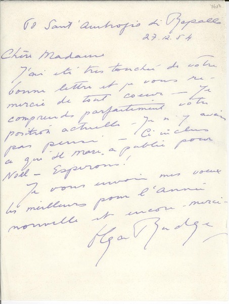 [Carta] 1954 dic. 27, Rapallo, [Italia] [a] [Gabriela Mistral] [manuscrito] Olga Rudge.