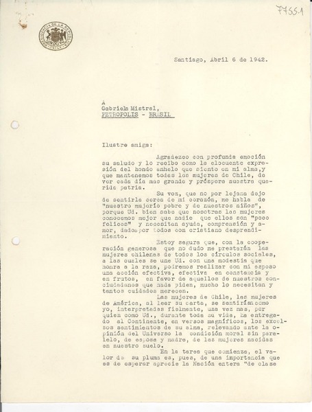 [Carta] 1942 abr. 6, Santiago, [Chile] [a] Gabriela Mistral, Petrópolis, Brasil [manuscrito] Marta Ide de Ríos.