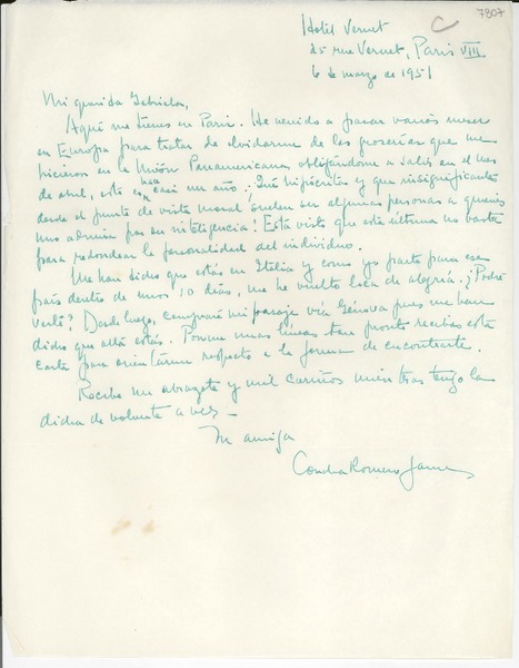 [Carta] 1951 mar. 6, París, [Francia] [a] Gabriela [Mistral] [manuscrito] Concha Romero James.