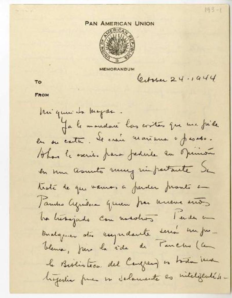 Estados Unidos [a] Magda Arce carta, 1944 octubre 24, [manuscrito] Concha Romero James.