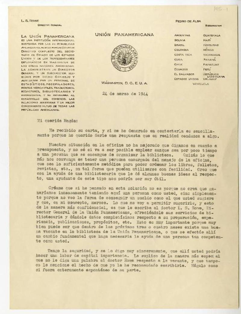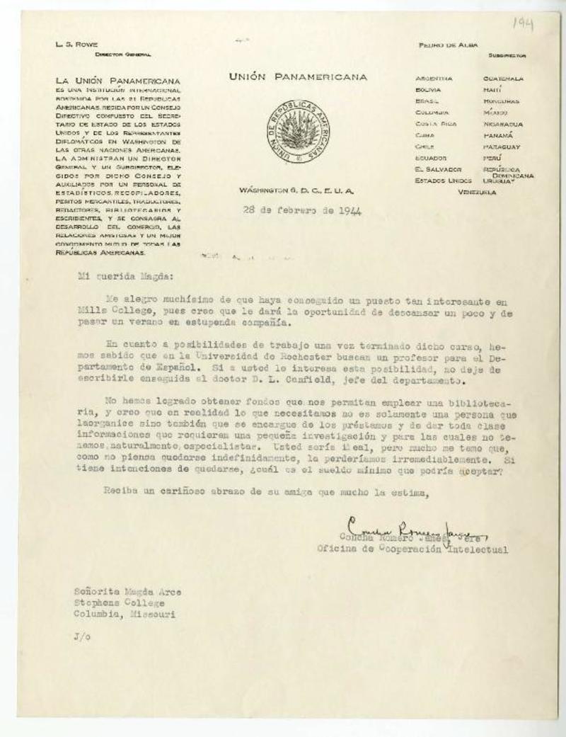 Washington, D.C. [a] Magda Arce, Stephens College, Columbia Carta, 1944 marzo 24, [manuscrito] Concha Romero James.
