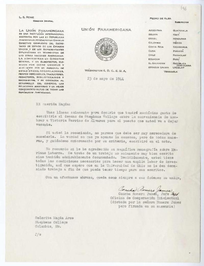 Washington, D.C. [a] Magda Arce, Stephens College, Columbia Carta, 1944 mayo 23, [manuscrito] Concha Romero, James.