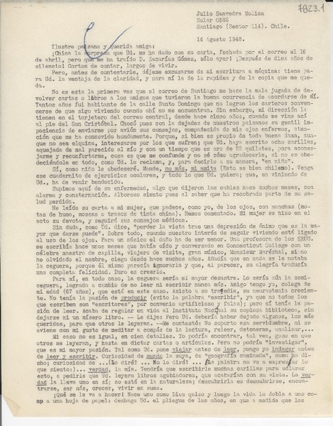 [Carta] 1948 ago. 14, Santiago, Chile [a] Gabriela Mistral [manuscrito] J. Saavedra.