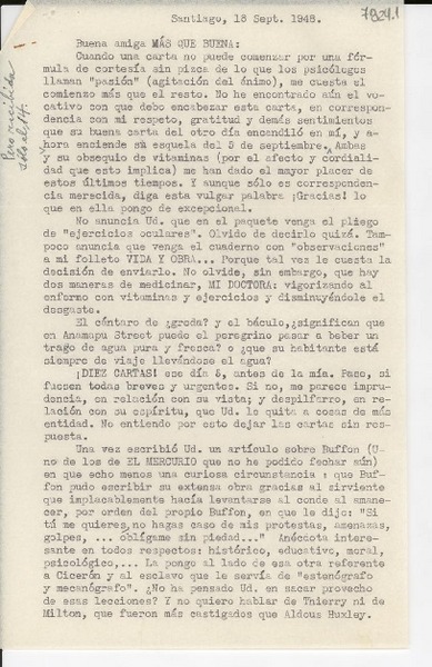 [Carta] 1948 sept. 18, Santiago [a] Gabriela Mistral [manuscrito] J. Saavedra.