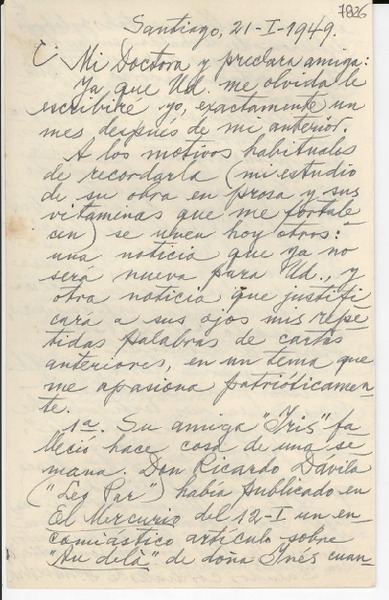 [Carta] 1949 ene. 21, Santiago [a] Gabriela Mistral [manuscrito] J. Saavedra.