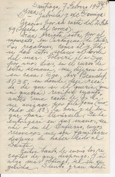 [Carta] 1949 feb. 7, Santiago [a] Gabriela Mistral [manuscrito] J. Saavedra.