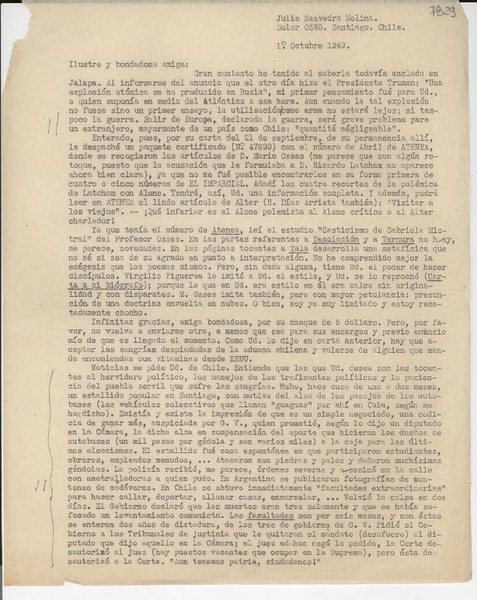 [Carta] 1949 mar. 23, Santiago [a] Gabriela Mistral [manuscrito] J. Saavedra.