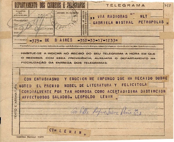 [Telegrama] 1945 dic. 5, [Brasil] [a] Leopoldo Lewin, Buenos Aires, Argentina [manuscrito] Gabriela Mistral.